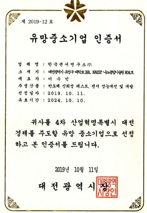 한국센서연구소, 2019 대전광역시 유망중소기업 선정