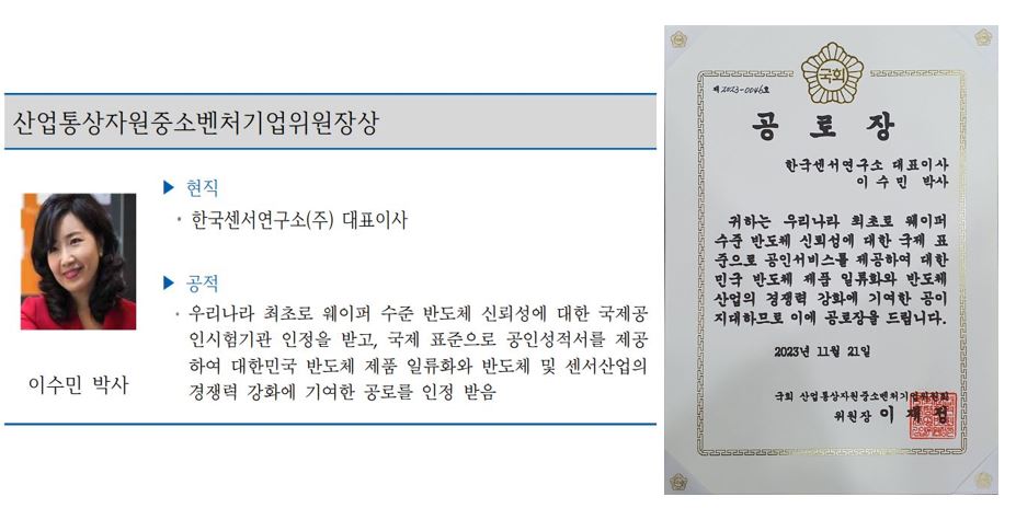 한국센서연구소 이수민 대표, 국회 과학기술 분야 최고 공로상 산업통상자원중소벤처기업위원장상 수상