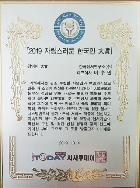 한국센서연구소 이수민 CEO는 지난 10월 4일 시사투데이에서 주관하는 자랑스러운 한국인 대상(경영인 부문)에 수상하였다.