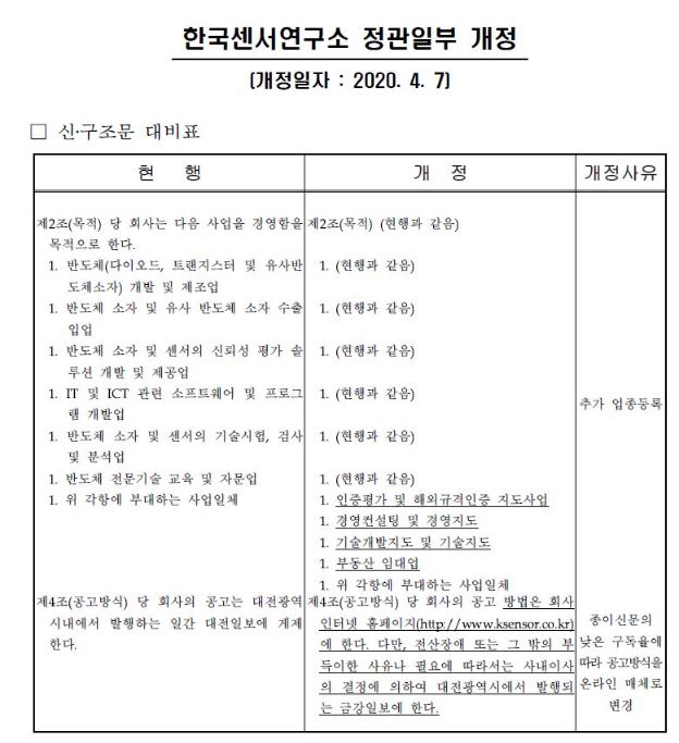 한국센서연구소 정관일부 개정 공고(2020. 4. 7.)