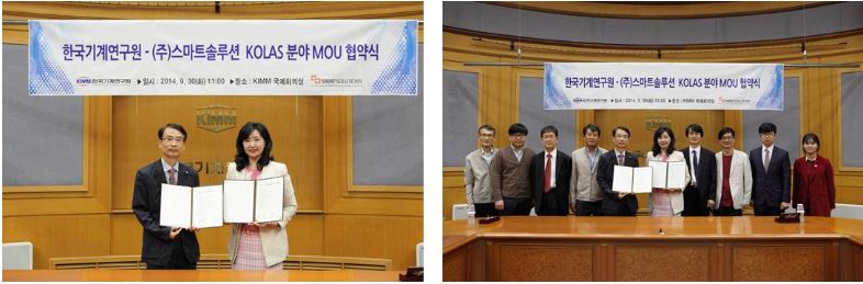 | 한국기계연구원, 중소기업과 시험분야 협력체계 강화 - 한국센서연구소와 기계/반도체 분야 KOLAS 인정 업무 협력- □ 미래창조과학부 산하 한국기계연구원(원장 임용택, 이하 기계(연))이 한국센서연구소(대표이사 이수민)(구 (주)스마트솔루션)과 기계분야와 환경 및 신뢰성 분야에서 KOLAS 인정 업무 협력을 확대해 나가기로 했다. □ 양 기관은 지난 9월 30일(화), 업무협약을 체결하고, 기계연이 수행해 오던 에너지효율, 음향특성, 진동특성 분야와 한국센서연구소가 수행하던 환경 및 신뢰성 분야 등의 KOLAS 인정 업무에 대해 상호 협력을 추진하기로 했다. □ 이번 협약을 통해 양 기관이 공인한 시험성적서는 세계 58개국에서 통용되며, 상대국에서 요구하는 시험을 국내에서 수행함으로써 국내 산업기술보호와 무역기술장벽 해소에 기여할 수 있을 것으로 기대하고 있다. □ 또한, 출연연과 중소기업이 상호 협력함으로써 틈새시장 진출에 창조적 시너지가 날 것으로 기대된다. □ 기계(연) 기술사업화센터 박희창 센터장은 “기계(연)과 한국센서연구소가 기계분야와 환경 및 신뢰성 분야에서 국제기준에 부합한 KOLAS 인정 시험의 공동 협력을 통하여 출연연구원과 중소기업이 상호 협력하는 발판을 마련하게 되었다는 점에서 의의가 있다”며, “이번 협약을 통해 기계(연)이 중소기업과 시험분야 협력 등 중소기업지원을 활성화하는 계기가 될 것”이라고 말했다. □한국센서연구소 이수민 대표이사는 “세계적 수준의 저주파노이즈 기술을 확보하고 있는 벤처기업으로서, 국내 유일의 반도체 소자 신뢰성 분야 KOLAS 인정기관인 한국센서연구소가 기계(연)과 상호 보완적인 KOLAS 인정 분야를 협력함으로써, 국내외 고객들에게 이 분야의 원스톱 서비스를 제공할 것으로 기대한다”고 밝혔다. |