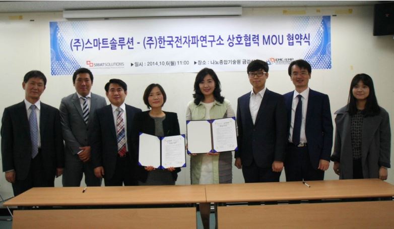 한국센서연구소(구 (주)스마트솔루션)(대표 이수민)과 ()한국전자파연구소(대표 장세희간의 상호협력 MOU 체결이 10월 6일 11시 나노종합기술원 1층 금강산 홀에서 진행되었다.