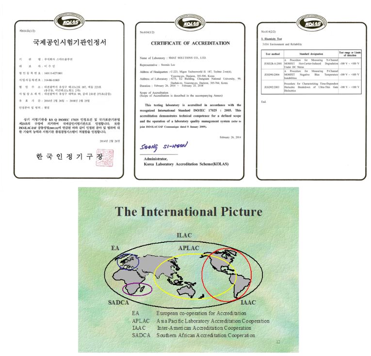 1) 세계 모든 곳에서 통용 2) 절차의 간소화로 수출비용이 절감 3) 측정의 신뢰도가 보장되어 제품품질 향상과 원가절감 한국센서연구소 대표이사는 “이번 KOLAS 인정은 그 동안 많은 분들이 지원해주고, 직원들이 땀 흘리며 열심히 애써준 결과라서 매우 감사하며, 소규모 벤처임에도 불구하고 국내 최초로 반도체 소자 신뢰성 시험의 전문성 및 기술력을 국제적으로 인정받게 되어 고무적이다.”라고 말했다. 또한 “앞으로 당사는 의뢰를 요청하는 고객들에게 고객만족과 제품의 품질향상을 위하여 시종일관 정성으로 보답하겠으며, 고객들의 요구에 더욱 부응할 수 있도록 저주파 노이즈(LF Noise) 분야의 인정도 준비하겠다”고 밝혔다. |