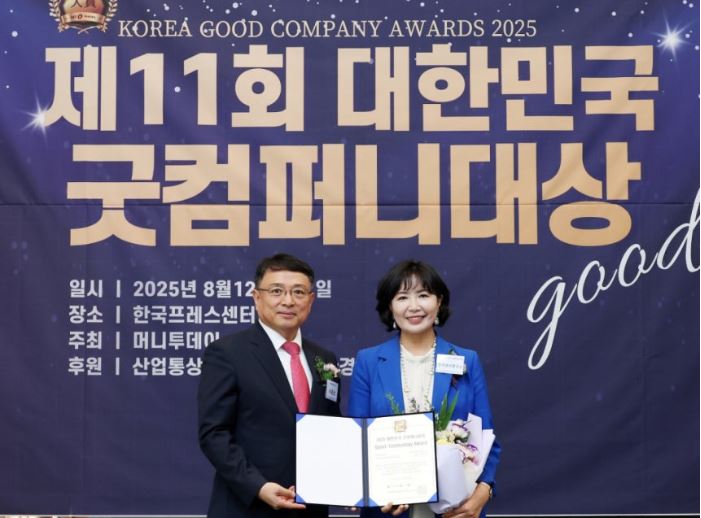 이수민 한국센서연구소 대표(사진 오른쪽)가 12일 오후 서울 중구 한국프레스센터에서 열린 머니투데이 주최의 '2025 제11회 대한민국 굿컴퍼니대상' 시상식에서 '7년 연속상'으로 '저주파 노이즈 분석' 부문 'Good-Technology Award'(굿-기술대상)를 수상하고 이종섭 동국대학교 교수와 기념사진을 촬영 중이다.